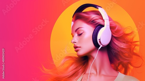 Fototapeta premium Beautiful girl in headphones creative poster. Music sound concept background....