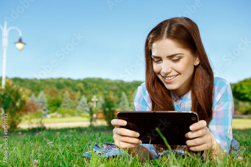 © LENSLOGIC, Fototapeta premium Beautiful girl in park with touchpad