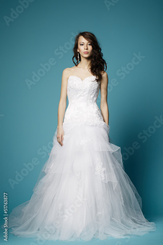 © Aliaksei Lasevich, Fototapeta premium beautiful girl in wedding dress on blue background
