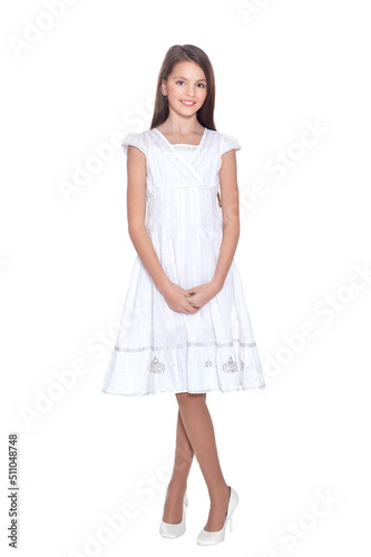 © aletia2011, Naklejka premium Beautiful girl in white dress posing on white background