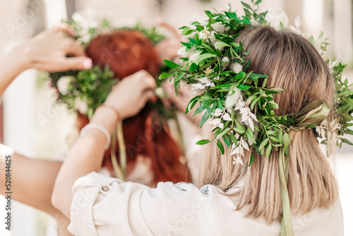 © sushytska, Obraz premium beautiful girl in wreath of flowers in meadow on sunny day. Portrait of Young beautiful woman wearing a wreath of wild flowers. Young pagan Slavic girl conduct ceremony on Midsummer. Earth Day