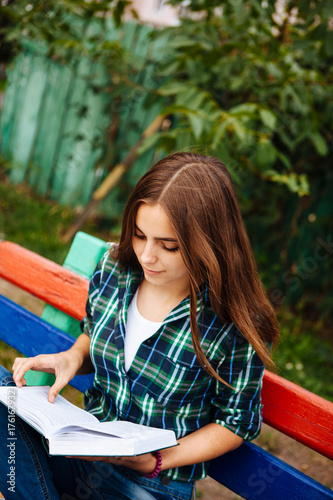 Obraz premium Beautiful girl reading book outdoors, with copy space
