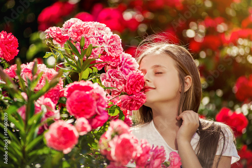 © sushytska, Obraz premium Beautiful girl standing in the park of roses.