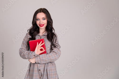 Fototapeta premium Beautiful girl student business women with red notebook on white, grey background.sign of approval