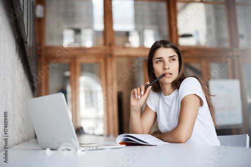 © Liubov Levytska, Obraz premium Beautiful girl studying in public library preparing for her graduation. Chosing career is not as easy as it seems. Education concept.