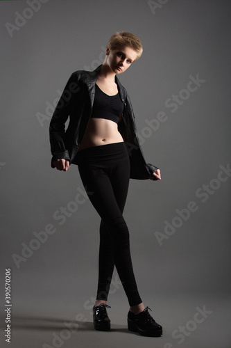 © Alexander, Obraz premium beautiful girl teenager in a black leather jacket and leggings posing in the studio on a gray background