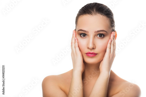 Fototapeta premium beautiful girl with clean skin natural gentle refreshing makeup on a white background isolate hands on face looking at the camera Spa treatment