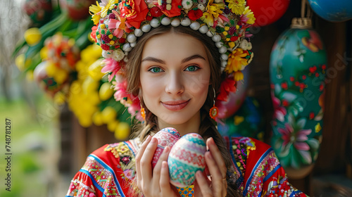 Fototapeta premium Beautiful girl with Easter eggs in her hands and festive attire