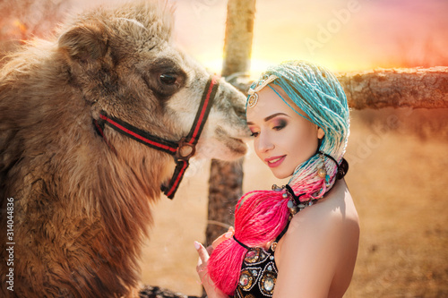 © Вероника Преображенс, Obraz premium Beautiful girl with multi-colored braids in oriental clothes. Princess with a camel at sunset. in desert