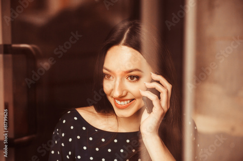 Fototapeta premium Beautiful girl works with technologise on the phone