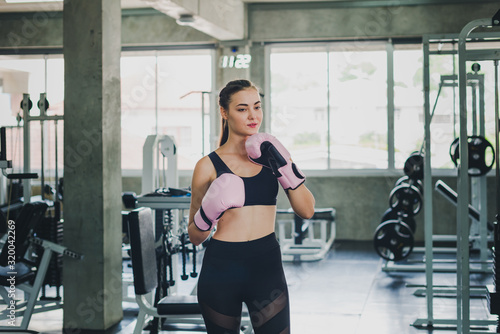 © Nawarit, Fototapeta premium Beautiful girls exercise by boxing in the gym. She wears a pink boxing glove and wears exercise.