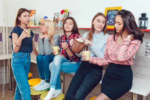 Obraz premium Beautiful girls standing in kitchen at the hostel talking and drinking tea.