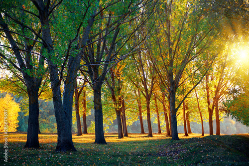 Fototapeta premium beautiful glade and trees in the autumn forest, bright sunset and landscape in fall season
