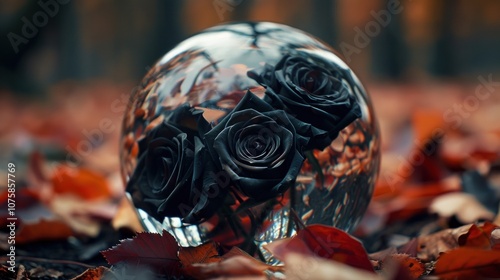 © Mas, Fototapeta premium Beautiful glass ball with burning black Rose, AI generated image