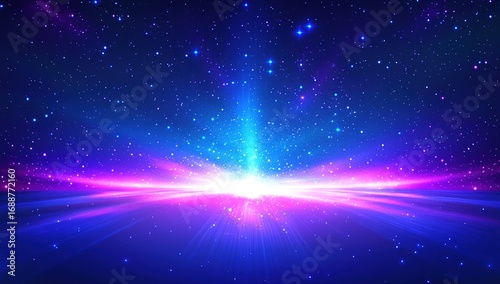 © SilentSmog, Naklejka premium Beautiful, glittering starry background with glowing particles and bokeh lights. Abstract blue, purple, and pink glow, a fantasy night sky. Vector illustration of a cosmic space background