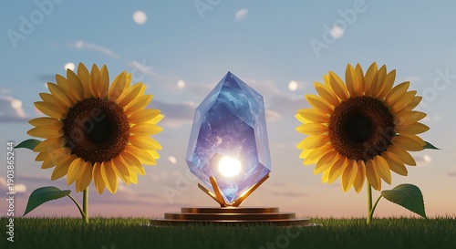© VectorStar, Obraz premium Beautiful glowing crystal gemstone placed between two sunflowers under a dreamy sky
