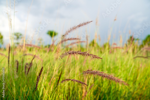 Fototapeta premium Beautiful golden grasses background blue sky clouds green garden sunrise sunset sun shine silhouette light idea travelling backpacker guiding backpacking camping campfire hiking relaxing resting