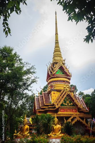 © kampwit, Fototapeta premium Beautiful golden pagoda with decorative Thai style fine art at public Buddhist Wat Phu Phlan Sung, Nachaluay, Ubon Ratchathani, Thailand.