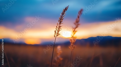 Fototapeta premium Beautiful golden sunset captured through tall grass with vibrant colors...