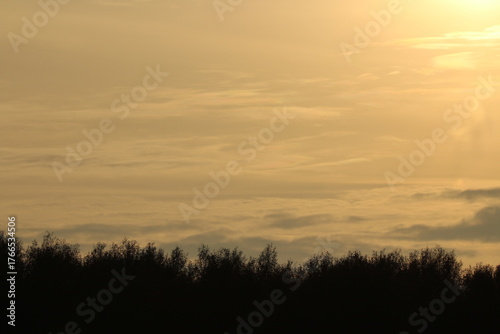 Obraz premium Beautiful golden sunset over the trees with golden clouds