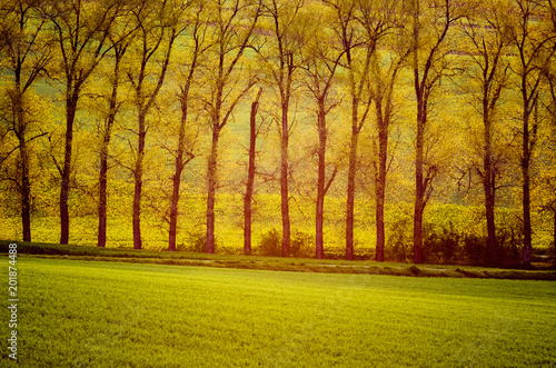 © Roxana, Fototapeta premium Beautiful golden trees in sun rays with meadow, natural seasonal background