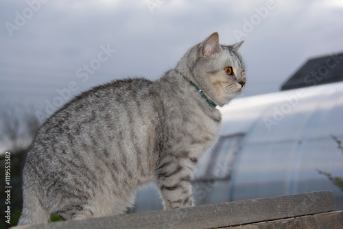 © Дмитрий Петров, Naklejka premium Beautiful gray British cat against a gray sky