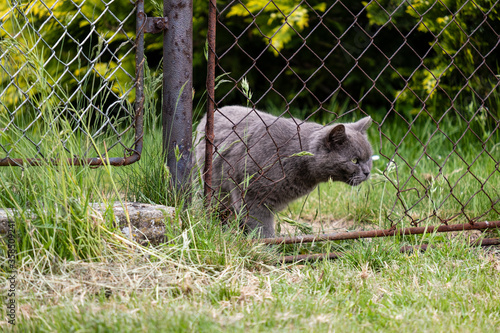 Naklejka premium beautiful gray cat looks through a hole in the cut fence and lurks for a mouse in the cut grass