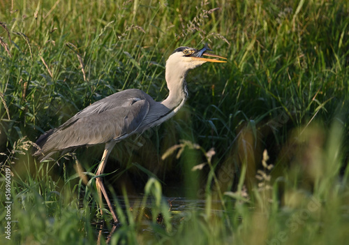 © Marina, Naklejka premium Beautiful great gray heron on the river catches fish