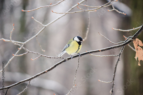 © emerald17, Fototapeta premium Beautiful Great Tit bird perched on a frost-covered tree branch in a peaceful winter forest scene