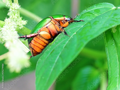 Fototapeta premium Beautiful green beetle Heterorrhina elegans sitting on a leaf, showing its...