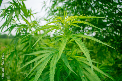Obraz premium Beautiful green cannabis leaves. It is an improved medicinal plant.