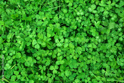 © New Africa, Obraz premium Beautiful green clover leaves and grass with water drops, top view