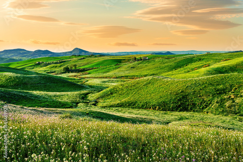 Fototapeta premium beautiful green evening meadow with bloom flowering field during amazing spring sunset among hills and farms with beautiful mountains with evening sky on baclground