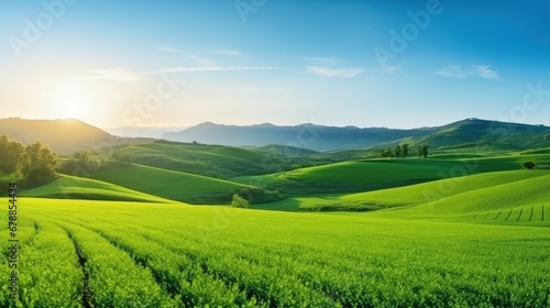 © JuJamal, Naklejka premium Beautiful green field of Cereal sprouts close-up in the morning in sunlight landscape, panoramic view.