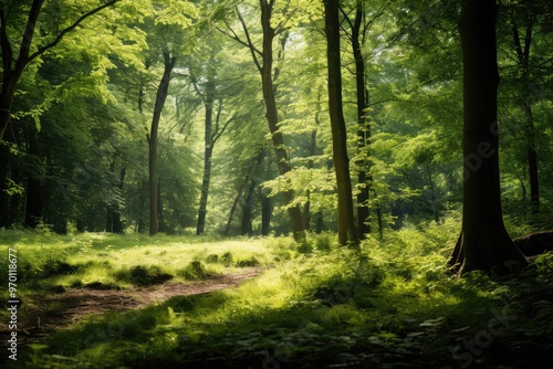 © Azadart, Naklejka premium Beautiful green forest and tree with sun reflection background, Natural background of tree and forest