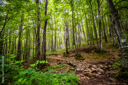 © miladrumeva, Fototapeta premium Beautiful green forest background photo
