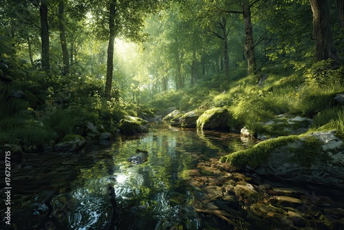 © Ifti Digital, Fototapeta premium Beautiful green forest illuminated by sunlight with a tranquil forest stream flowing gently over smooth rocks and surrounded by lush foliage