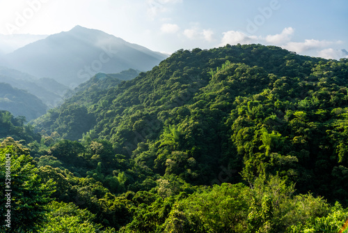 © BINGJHEN, Fototapeta premium Beautiful green forest in the mountains with the blue sky background