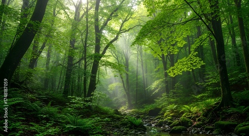 Fototapeta premium Beautiful green forest landscape with sunlight shining through trees nature...