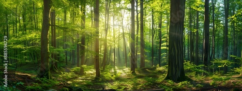 Obraz premium Beautiful green forest with tall trees and sunlight in spring or summer,...