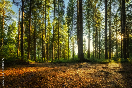 © Svetliy, Obraz premium Beautiful green forest with the setting sun