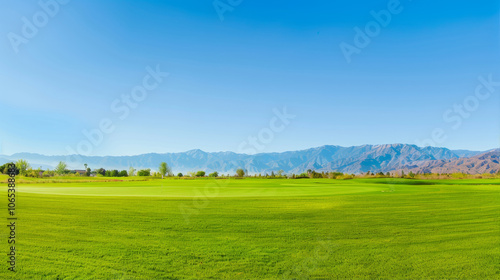Fototapeta premium Beautiful green grass field with a blue sky and mountain