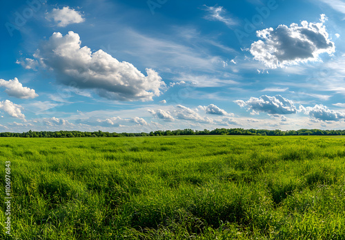 © Nim, Fototapeta premium Beautiful green grass meadow landscape with a blue sky and white clouds.