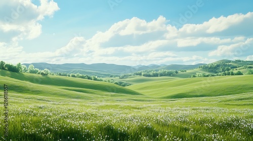 © MiltonKumar, Obraz premium Beautiful green hills under blue sky on sunny day high resolution image