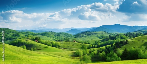 © orendesain99, Obraz premium Beautiful Green hills with mountains landscape with blue sky view. AI generated