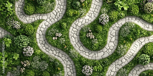Fototapeta premium beautiful green labyrinth with green and cream stones paving and different flowers top view
