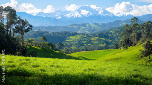 Obraz premium Beautiful green meadow, with a forest and mountains in the background