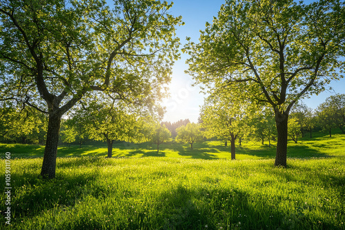 Obraz premium Beautiful green meadow with trees and a blue sky on a sunny day