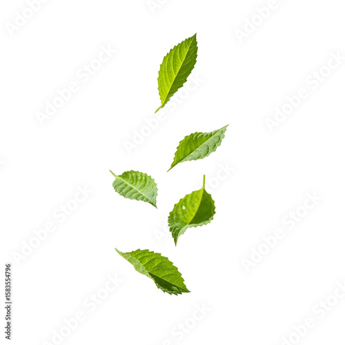 © NazninSultana, Fototapeta premium Beautiful green mint leaves falling against on white background