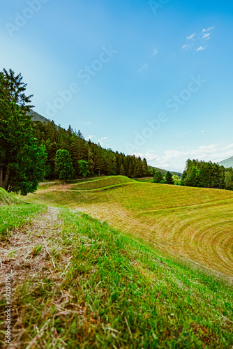 © Bento, Naklejka premium Beautiful Green Pasture Hillside near a Forest